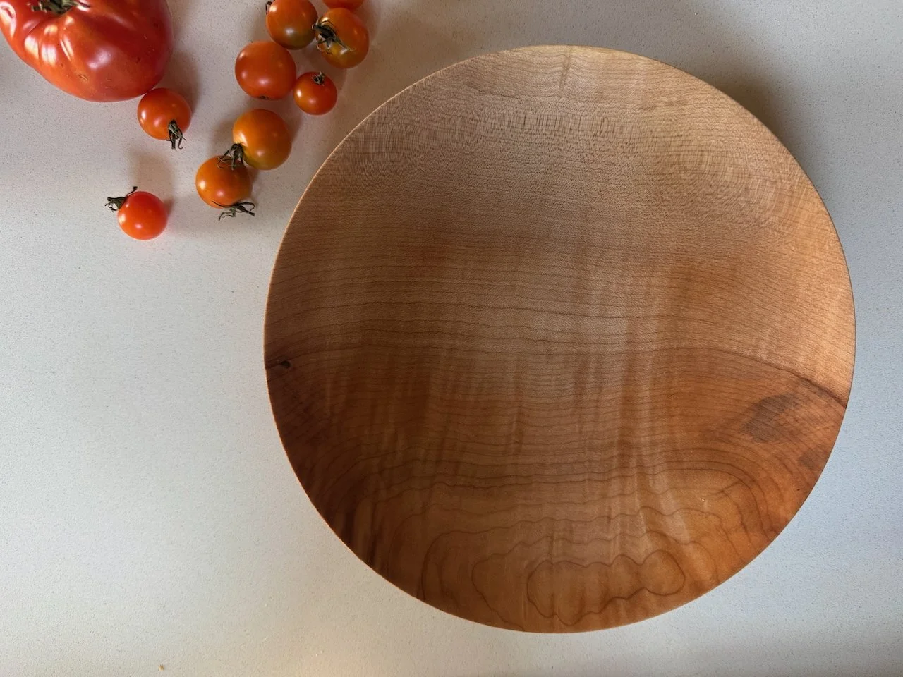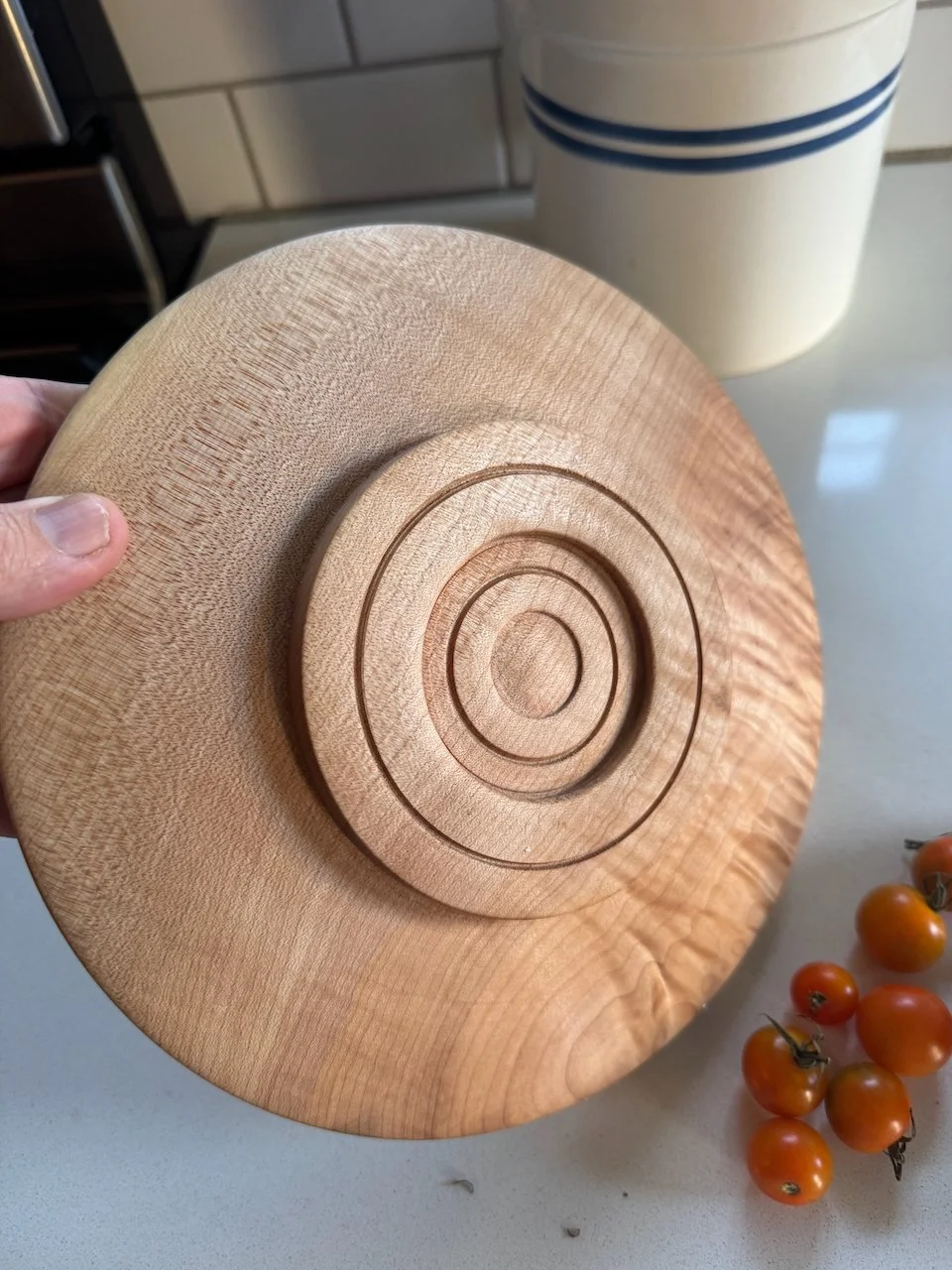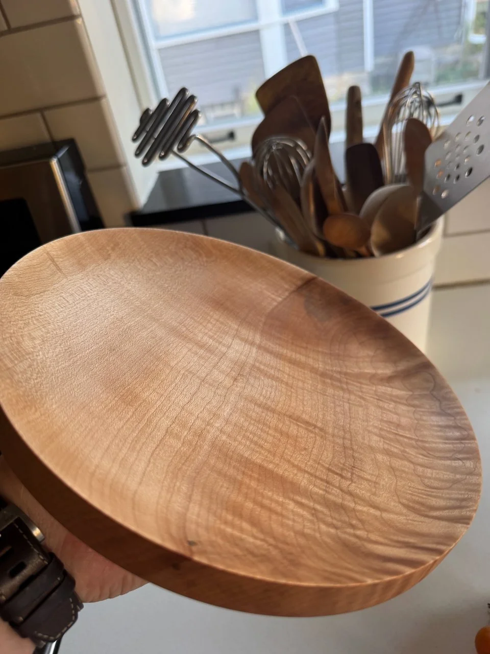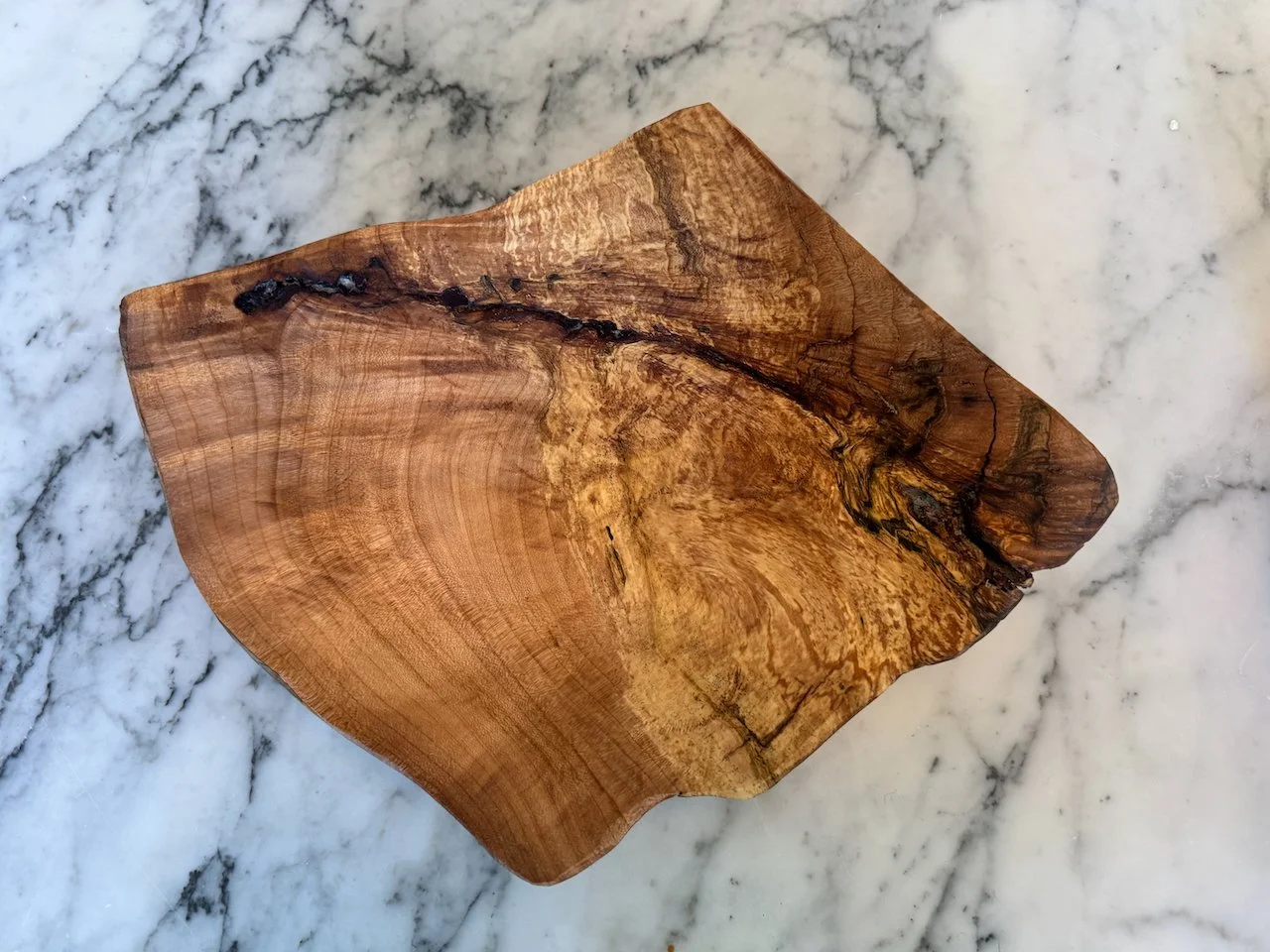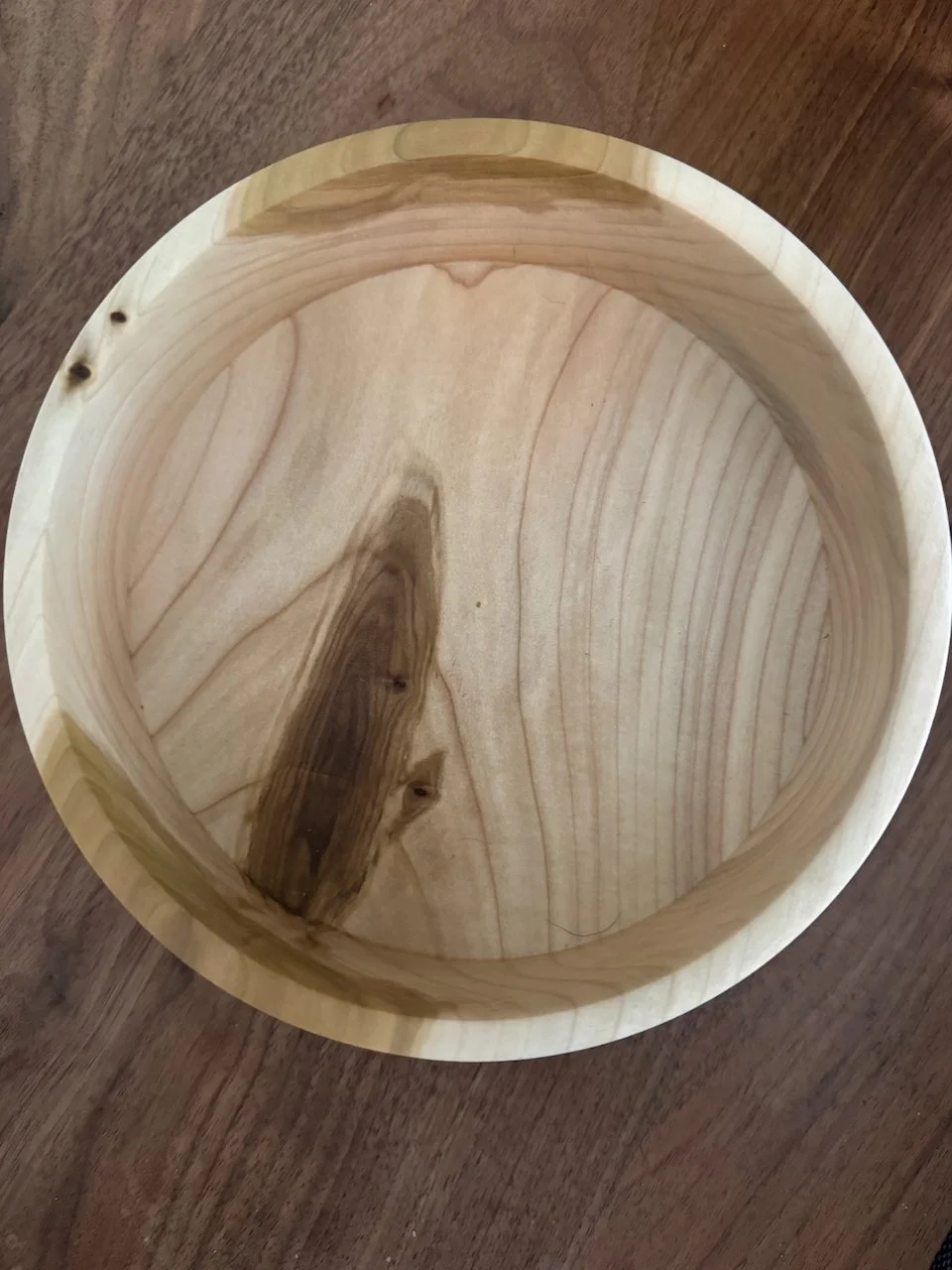 This elm bowl has a wide grain and high contrast with a portion featuring a warmer knot. Its smooth, rounded form is simple and quiet.